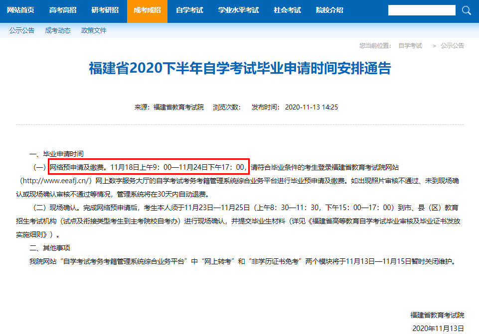 近日,福建省教育考试院发布2020年下半年自考毕业申请时间安排!